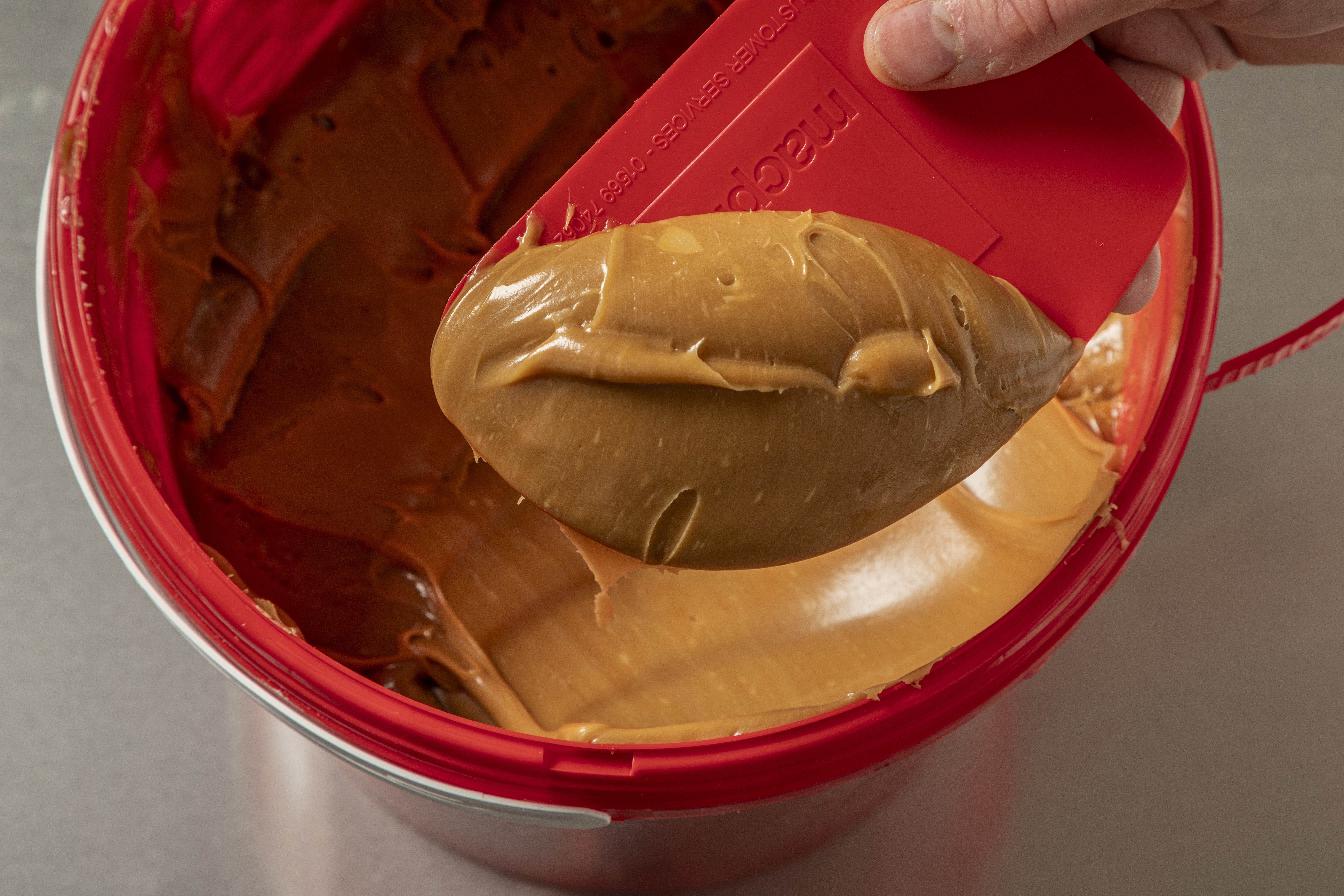 Can be warmed over a bain-marie directly in the pail, or by decanting into a heat proof bowl. Warm until the caramel loosens to suit spreading, flooding, piping or injection application uses. It will set back again to its original texture after cooling, you can then slice with a warmed knife or ultrasound cutter.